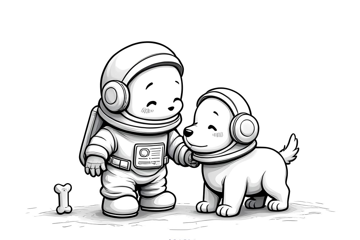 An endearing coloring page showing a small astronaut playing with a space puppy. This simple design features basic shapes and wide spaces perfect for young children's first coloring adventures.