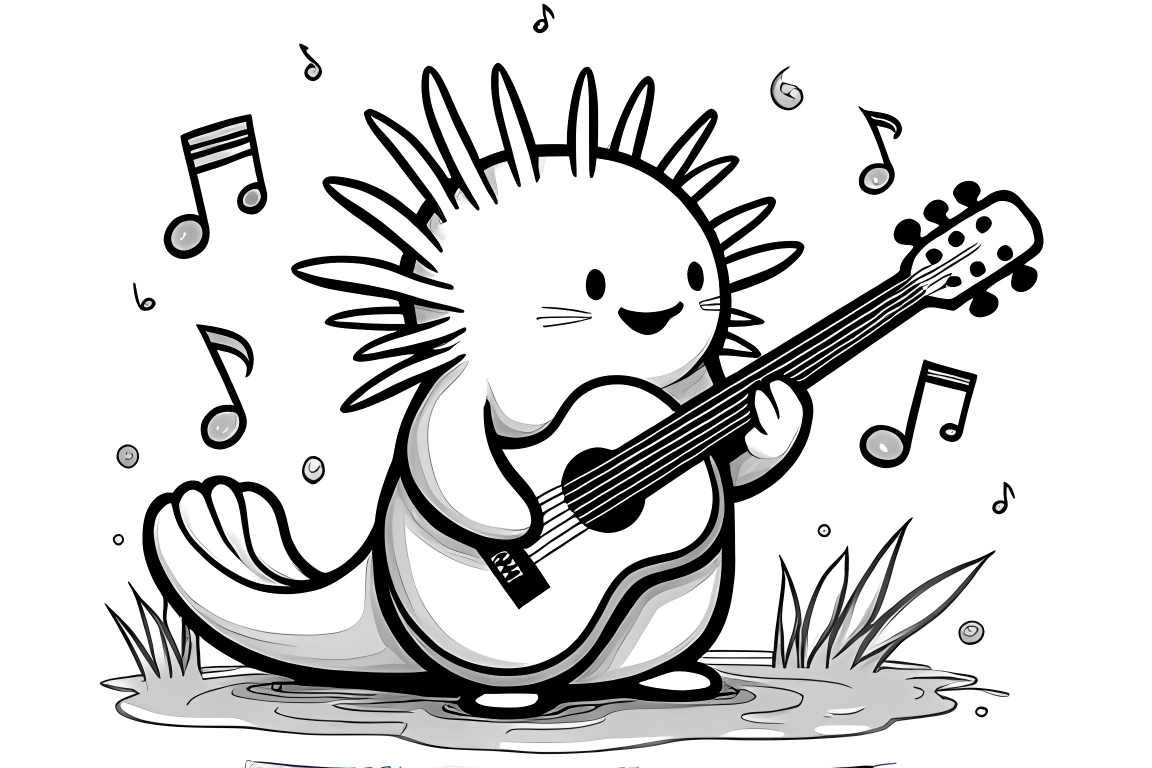 A cheerful scene of an axolotl playing musical instruments. Includes moderate details perfect for elementary school children.