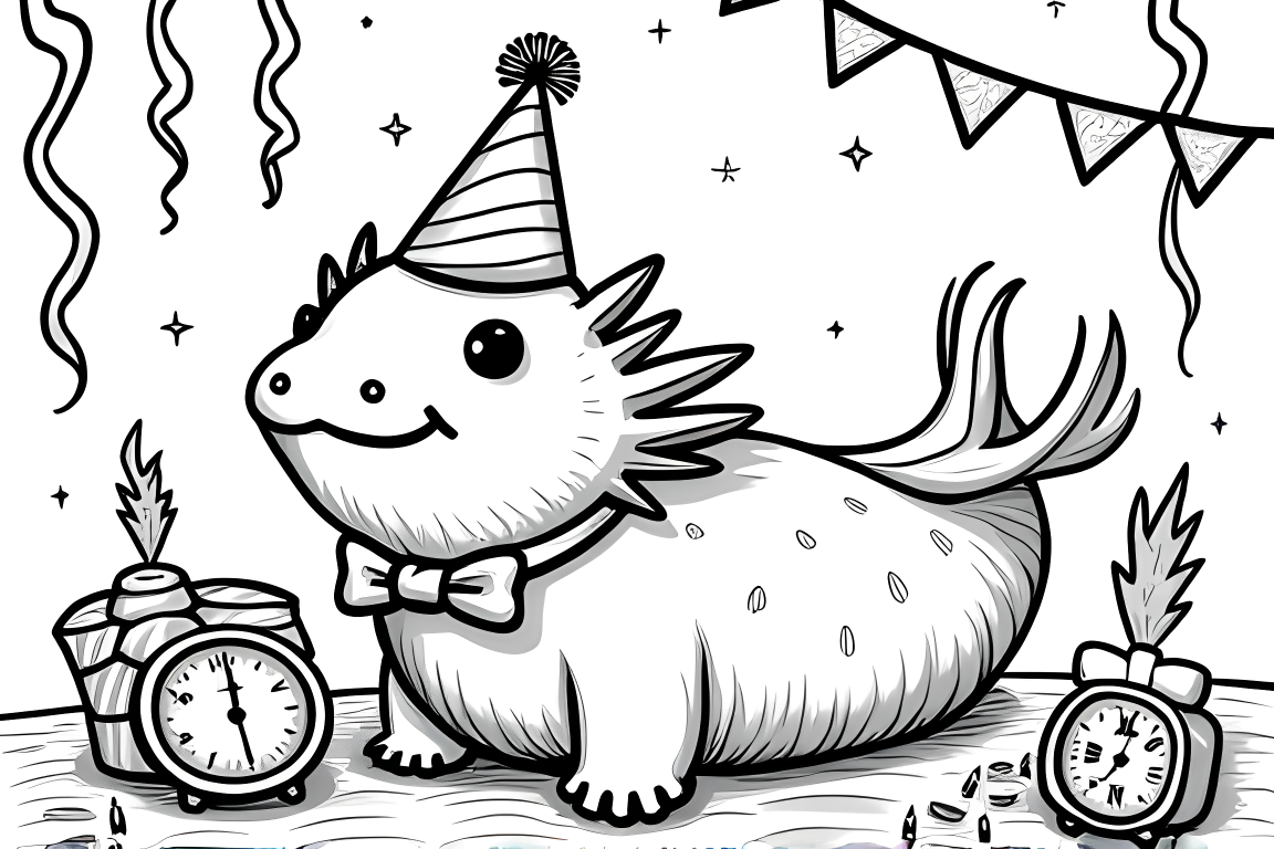 An elaborate coloring page showing an axolotl hosting a New Year celebration with party decorations and countdown clock. Designed for older children who enjoy more detailed coloring challenges.