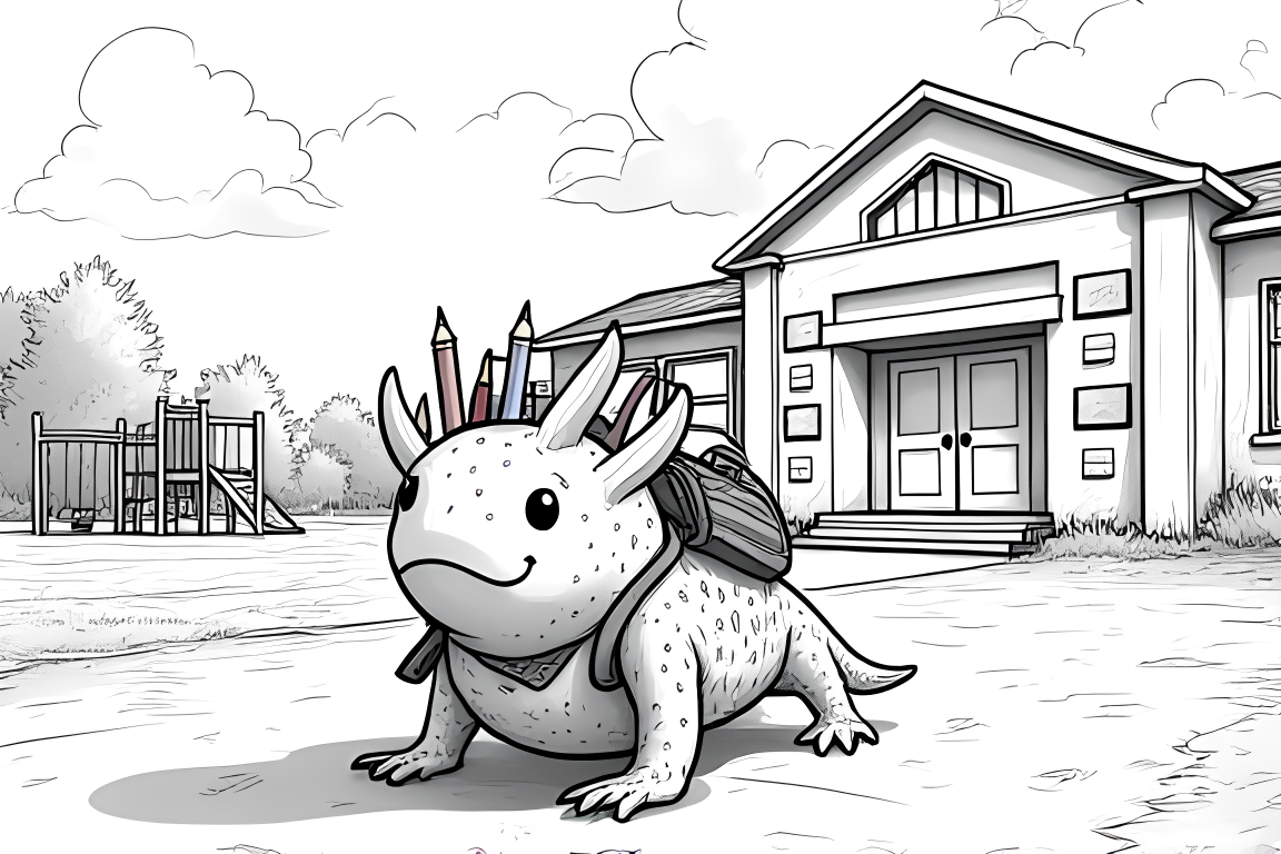 An engaging coloring page showing an axolotl wearing a backpack and heading to school. Perfect for elementary school children with moderate detail level.