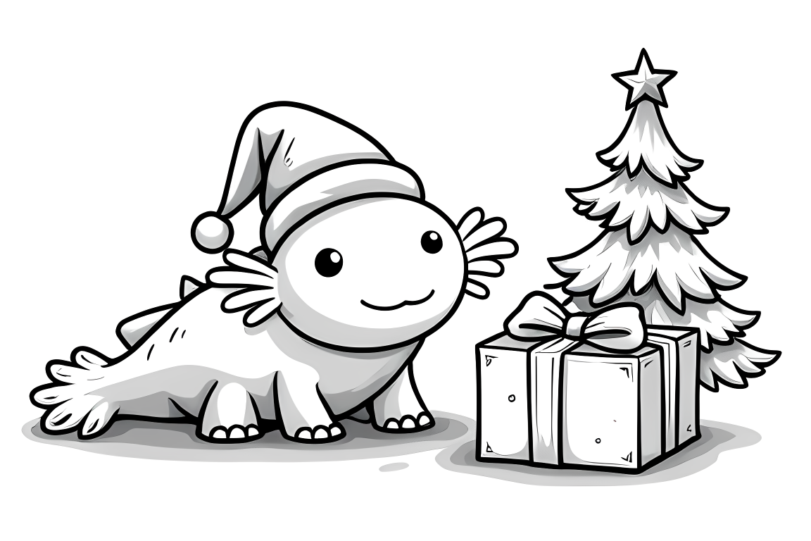 An adorable baby axolotl wearing a tiny Santa hat discovers a Christmas present under a small decorated tree. This simple coloring page is perfect for introducing toddlers to holiday-themed art with basic shapes and minimal details.