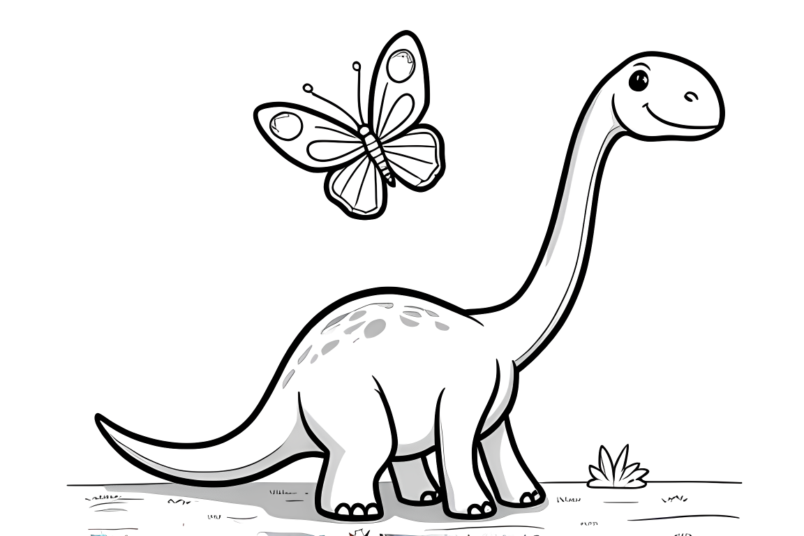 A gentle coloring page featuring a friendly baby brachiosaurus watching a butterfly. This simple illustration is perfect for introducing toddlers to dinosaurs through easy-to-color shapes and basic outlines.