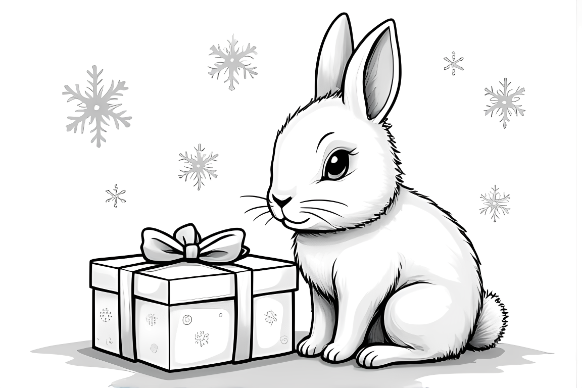 An adorable baby rabbit discovering a small Christmas present, designed specifically for toddlers' first coloring adventures. The simple shapes and minimal details make it perfect for developing motor skills.