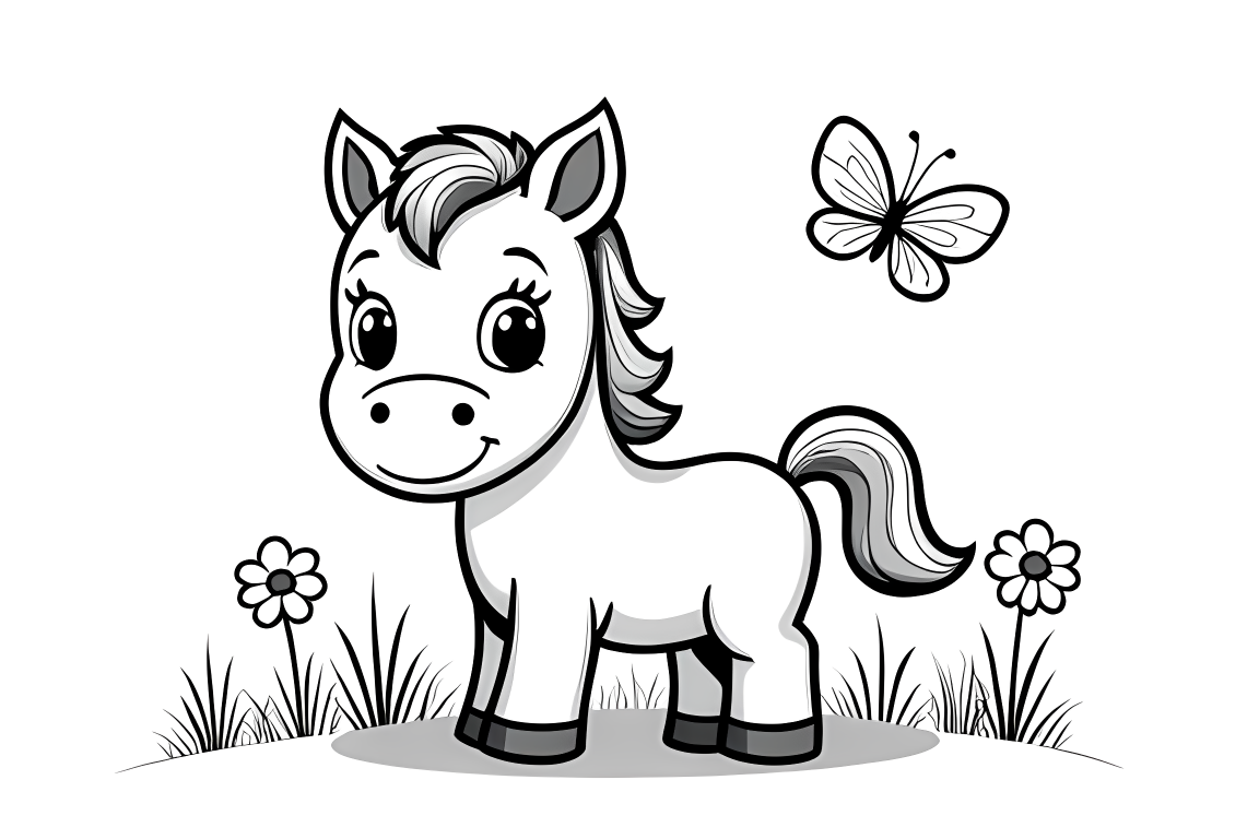 A simple and adorable coloring page featuring a baby horse playing in a garden with butterflies. Perfect for introducing toddlers to the joy of coloring with basic shapes and gentle lines.