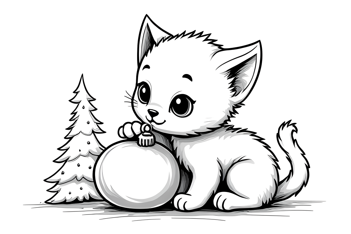 An adorable baby kitten discovering a small Christmas ornament, designed specifically for toddlers' first coloring experience. The simple shapes and large spaces make it perfect for developing early coloring skills.