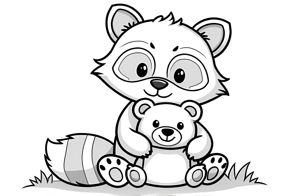 A heartwarming coloring page featuring a baby raccoon hugging a teddy bear, designed specifically for toddlers' early coloring adventures. The simple lines and large spaces make it perfect for developing fine motor skills in young children.