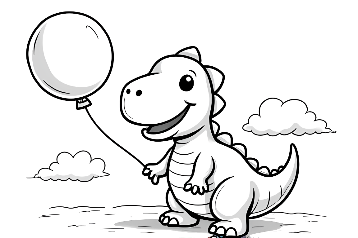 A charming coloring page featuring a friendly baby T-Rex holding a big balloon. This simple and engaging illustration is perfect for toddlers learning to color within lines. The rounded shapes and minimal details make it an ideal first dinosaur coloring experience.