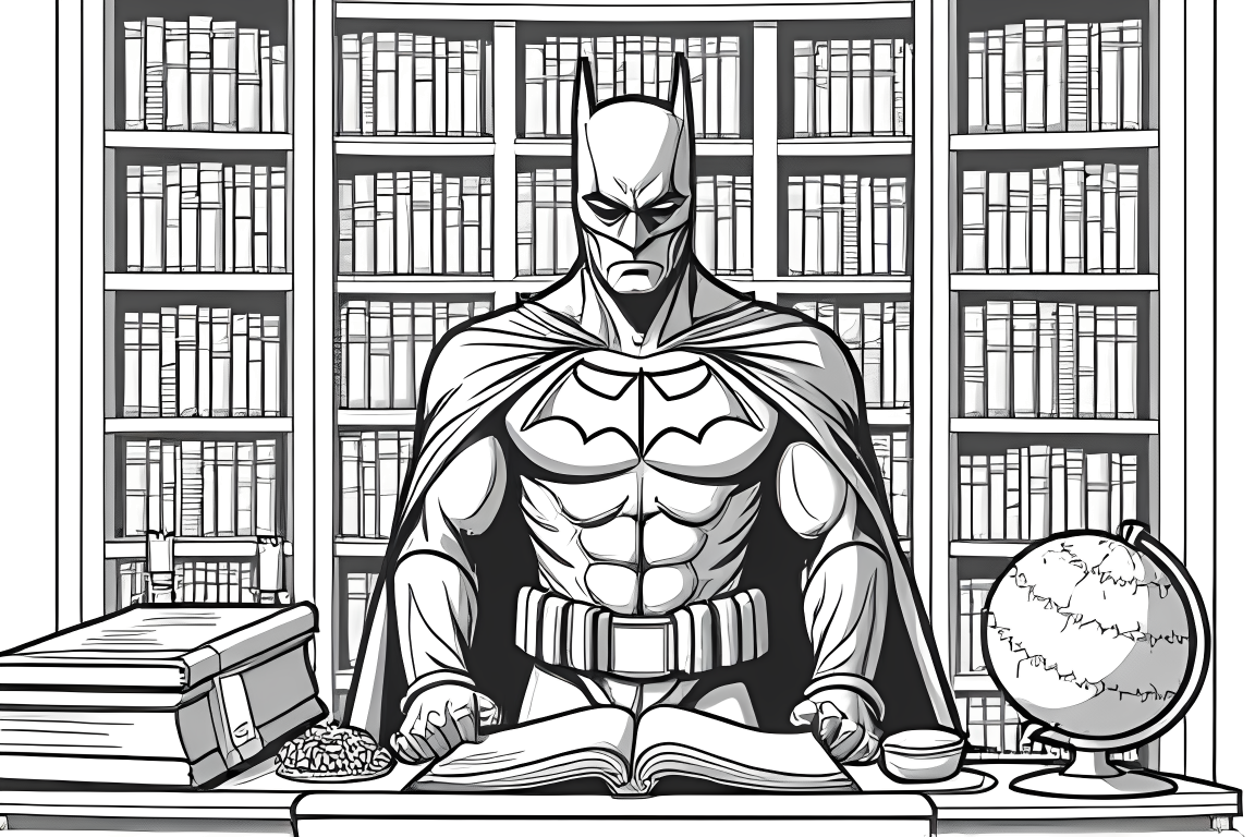 An intricate coloring page featuring Batman in his vast secret library. The design includes bookshelves, ancient artifacts, and study areas.