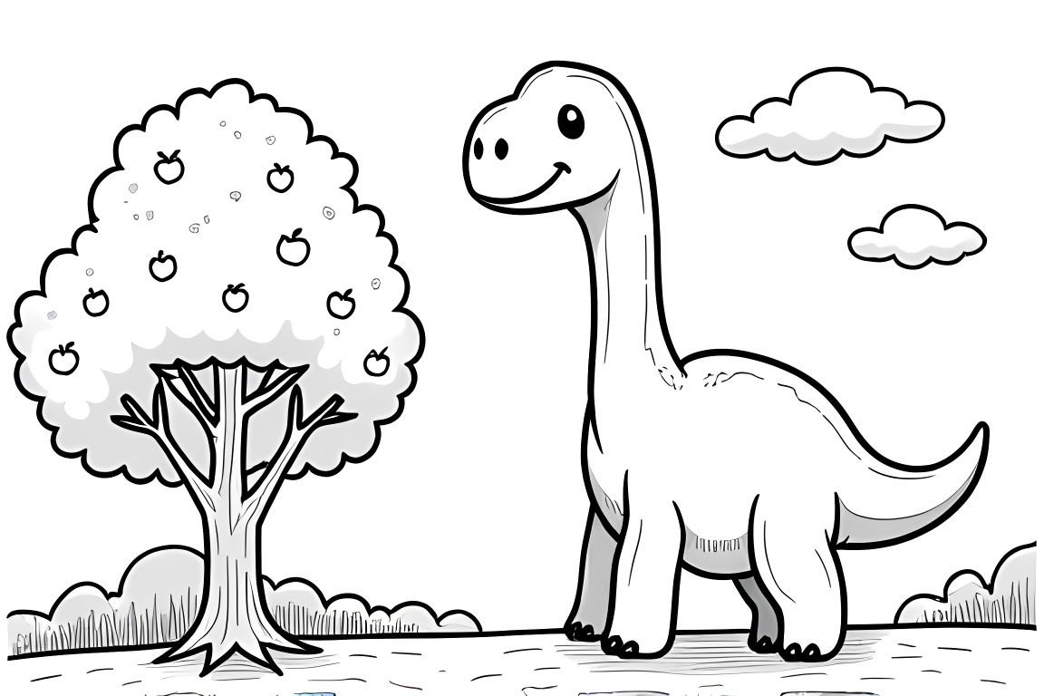 An adorable coloring page showing a friendly brachiosaurus reaching for apples on a tree. The large, simple shapes and minimal details make this illustration perfect for young children starting their coloring journey.