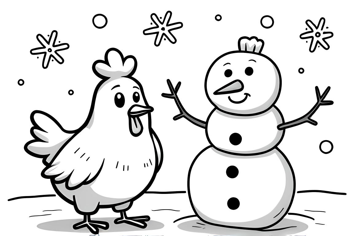 A heartwarming coloring page featuring a friendly chicken meeting a simple snowman. Perfect for toddlers with its basic shapes and wide coloring areas.