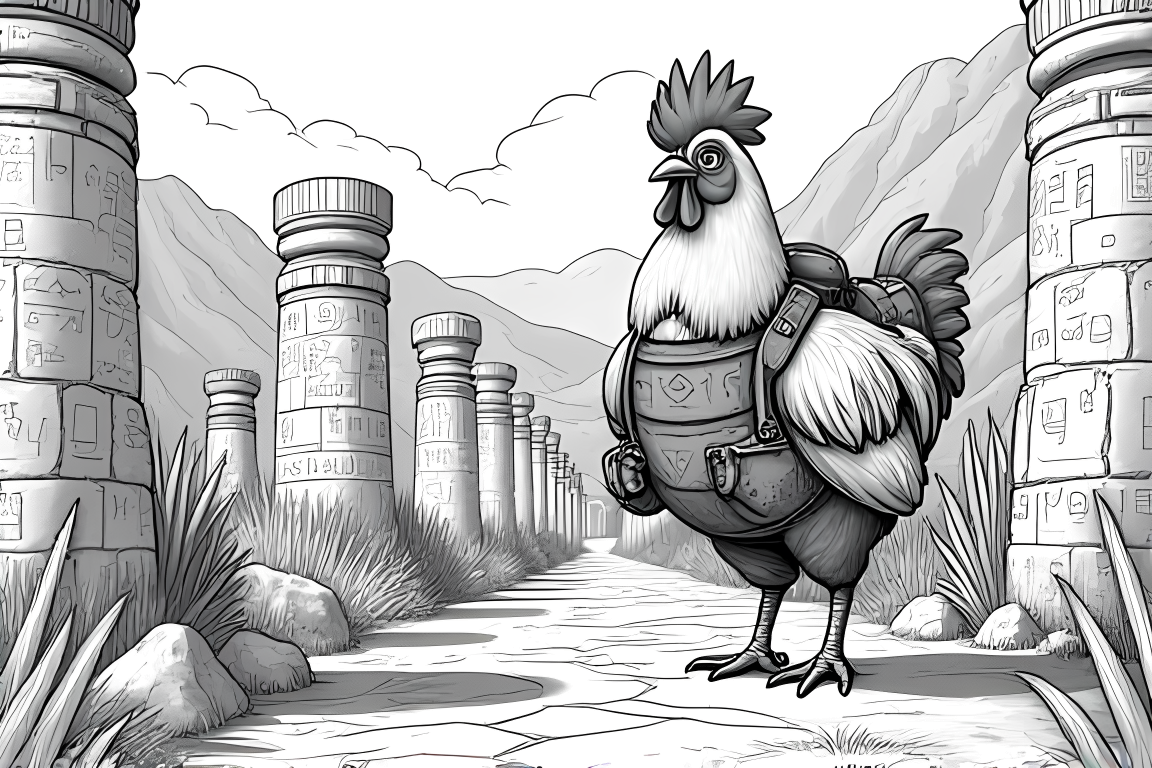 An adventurous coloring page featuring a chicken archaeologist exploring ruins. Designed with intricate details for advanced coloring skills.