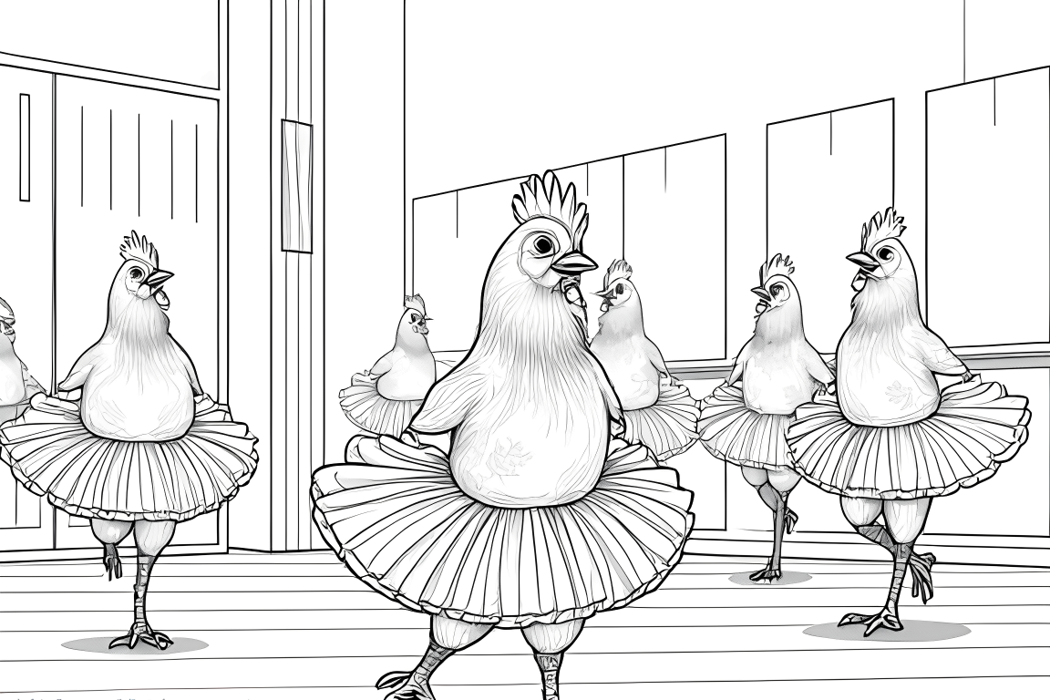 An active coloring page featuring a chicken in a dance class. Perfect for school-age children who love movement.