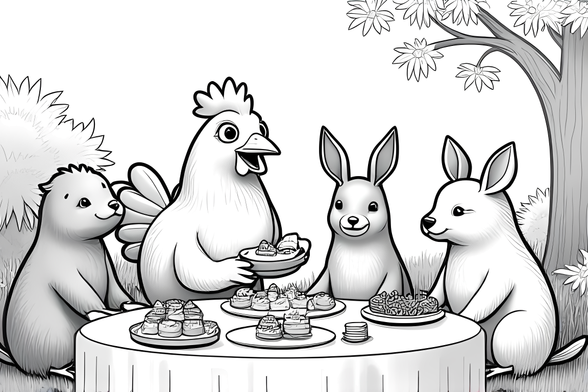 A cheerful coloring page of a chicken hosting a garden party. Designed with moderate detail for developing coloring skills.