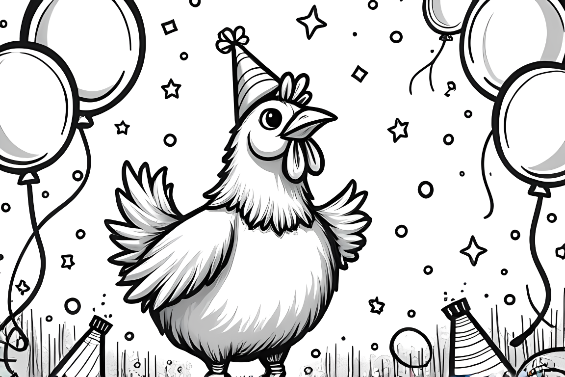 An elaborate New Year celebration scene with a chicken as the party host. This detailed coloring page challenges older children while maintaining clear coloring spaces.