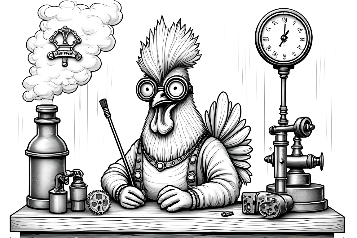 A detailed coloring page showing a chicken inventor in a steampunk-styled workshop. Designed for older children with advanced coloring skills.