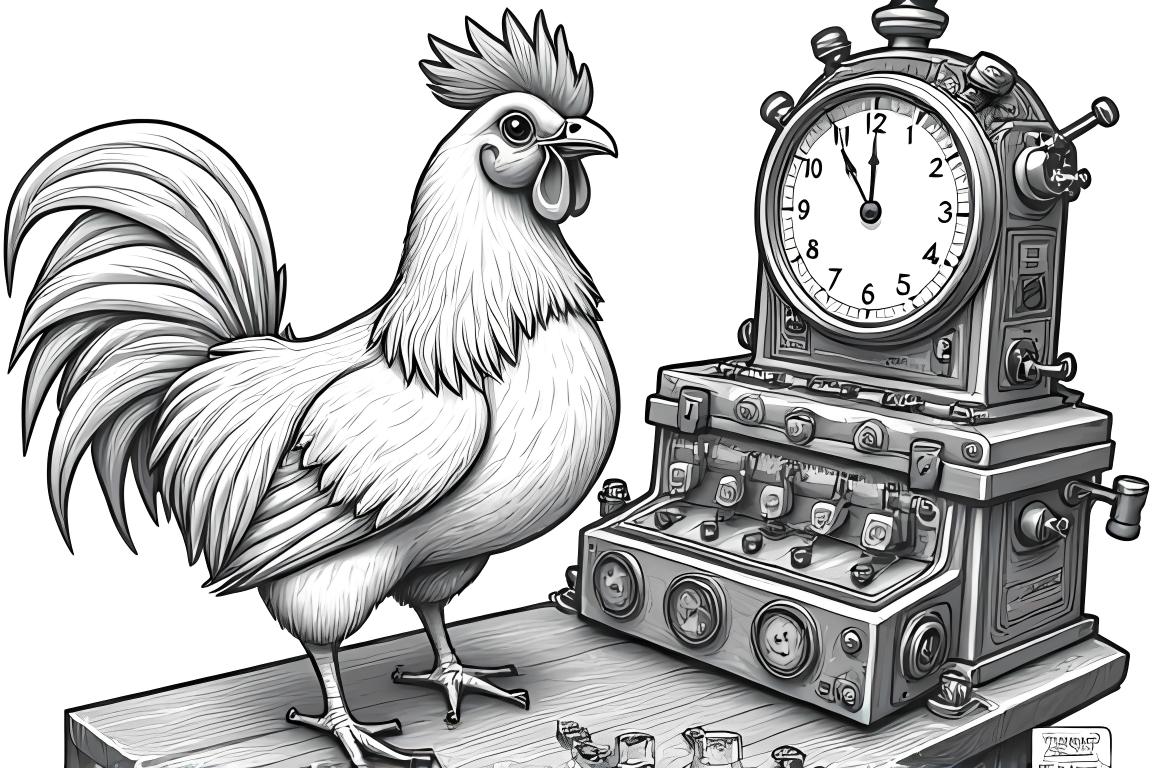 An exciting coloring page featuring a chicken piloting a detailed time machine. Perfect for older children who enjoy science fiction themes.