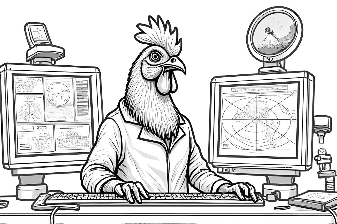 A scientific coloring page featuring a chicken meteorologist studying weather patterns. Perfect for older children interested in science.