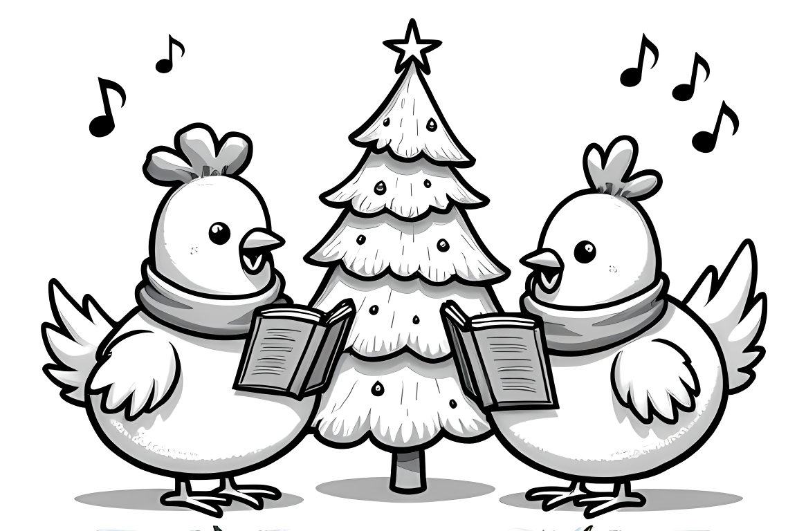 A delightful scene of chickens singing carols around a Christmas tree. This coloring page offers just the right amount of detail for first-grade students.