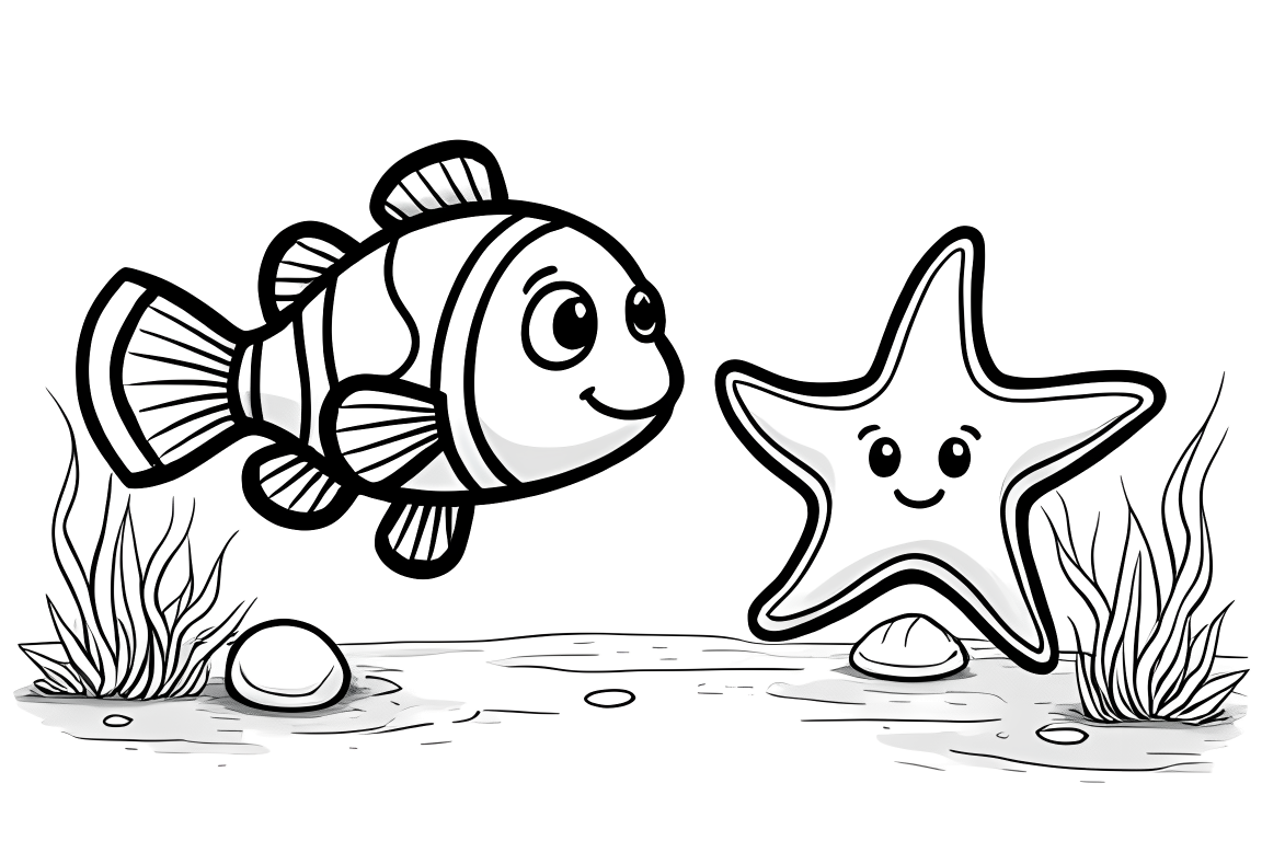 An easy-to-color page showing a friendly clownfish meeting a smiling starfish. This simple design features basic shapes and large coloring areas perfect for toddlers developing their coloring skills.
