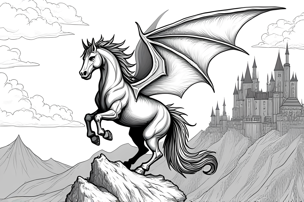 An epic coloring page of a horse with dragon-like features. Features intricate fantasy elements perfect for older elementary school children.