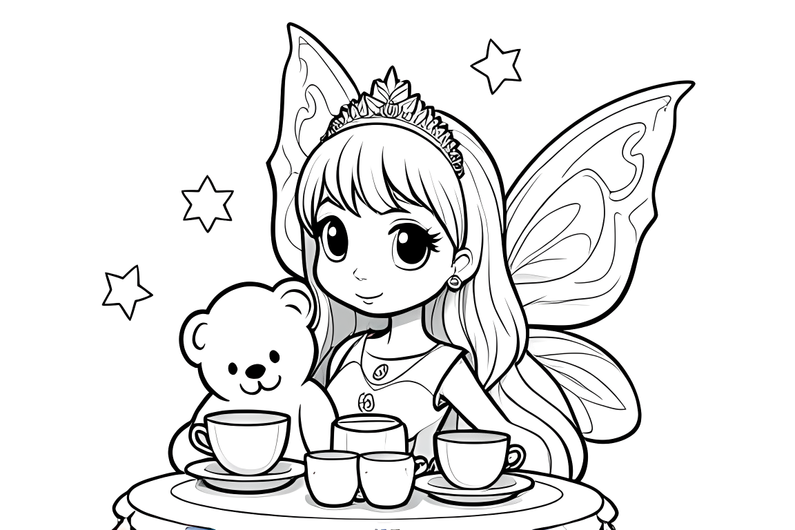 An enchanting coloring page showing a fairy princess having tea with her teddy bear friend. The straightforward design and basic shapes are specially crafted for young children starting their coloring journey.