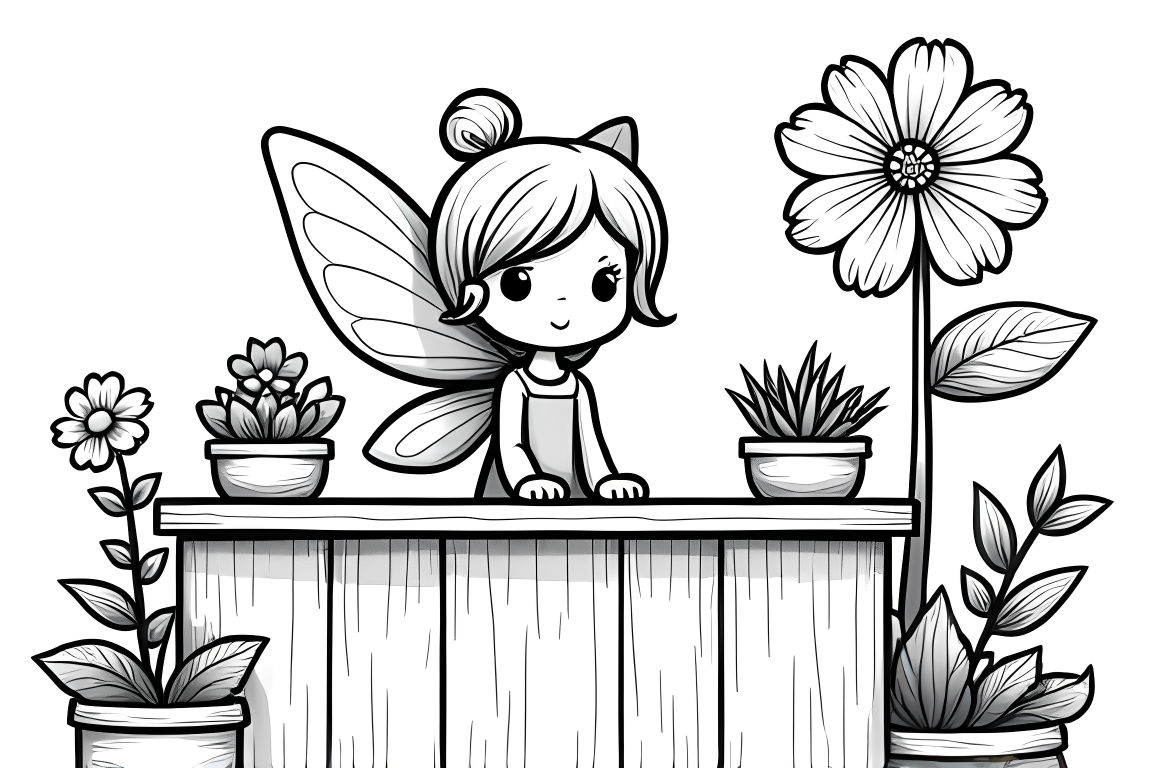 A sweet coloring page showing a fairy running her own magical flower shop. This entrepreneurial scene combines magic with everyday activities, perfect for inspiring 6-year-olds.