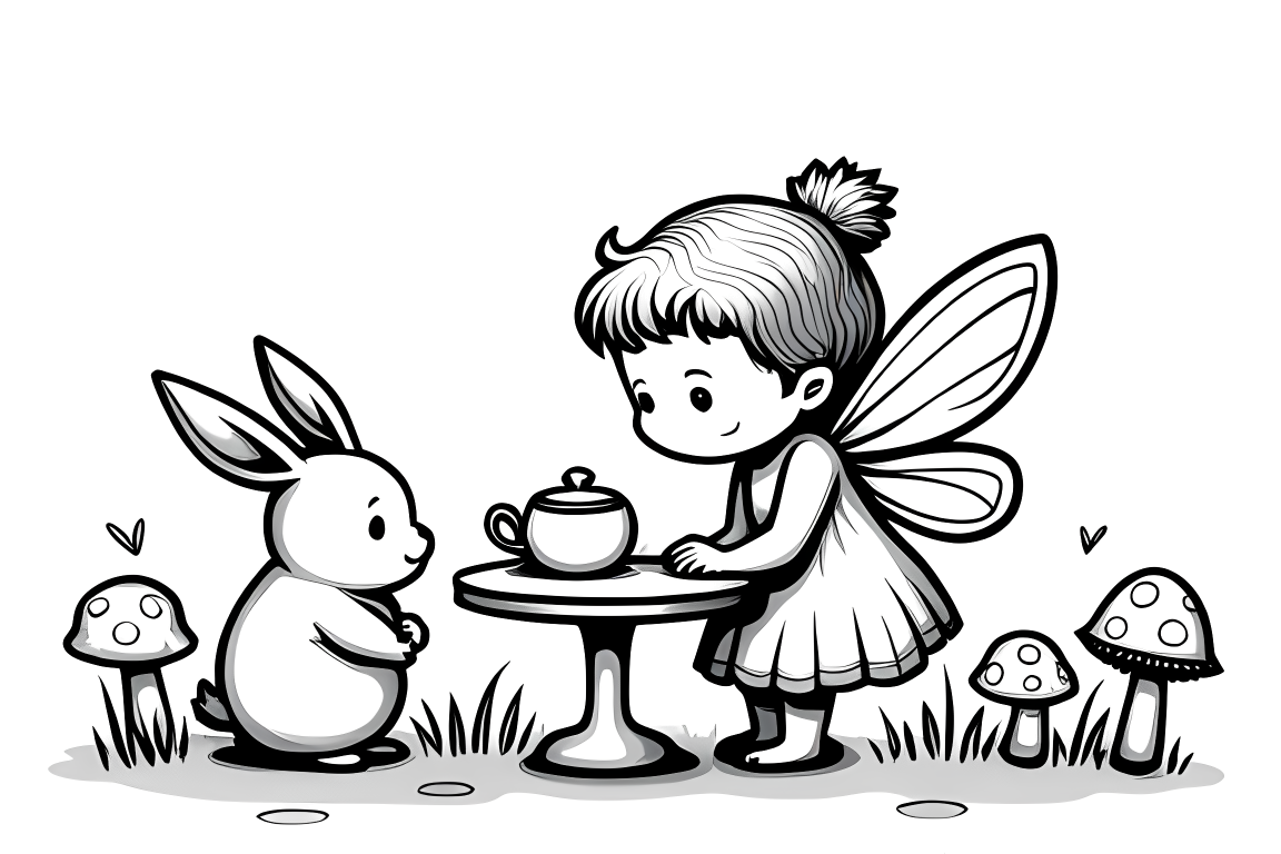An enchanting coloring page showing a fairy having a tea party with her forest friends. The basic shapes and uncomplicated design make it ideal for toddlers to practice coloring. Features large, clear areas perfect for little hands.