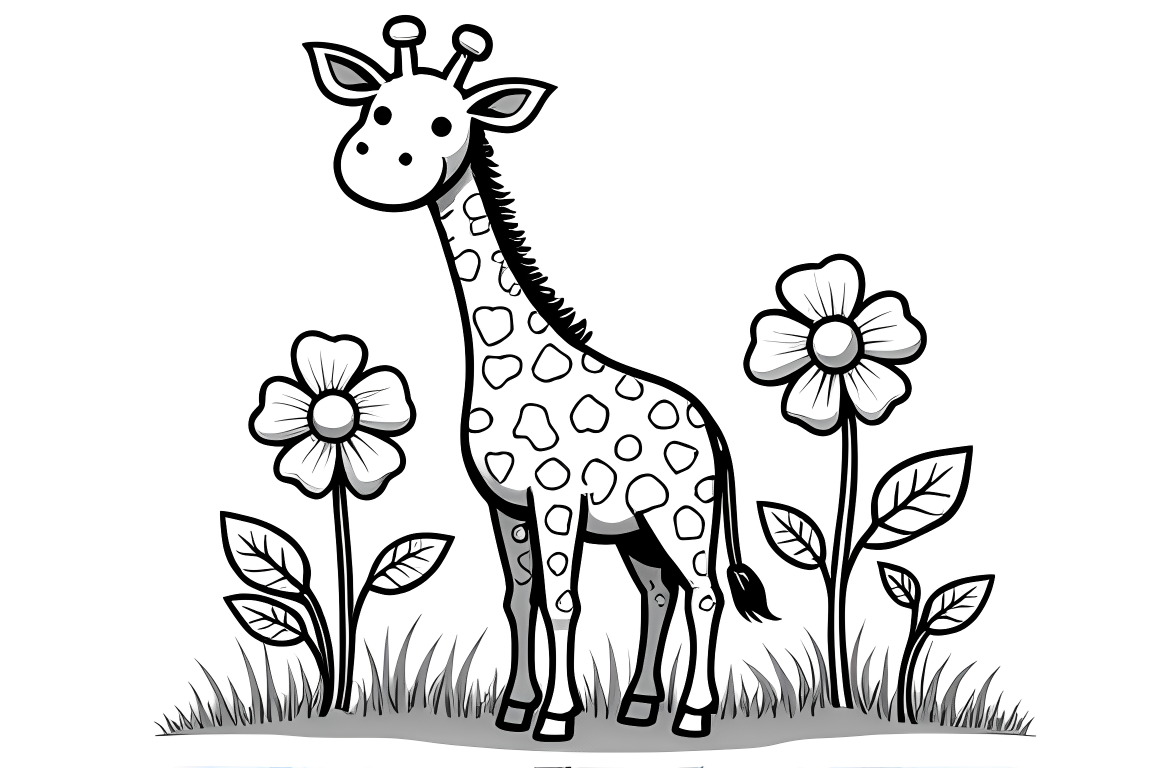 A delightful coloring page showing a friendly giraffe surrounded by oversized flowers, designed specifically for toddlers. The large, simple shapes create an engaging scene that's easy for little hands to color.