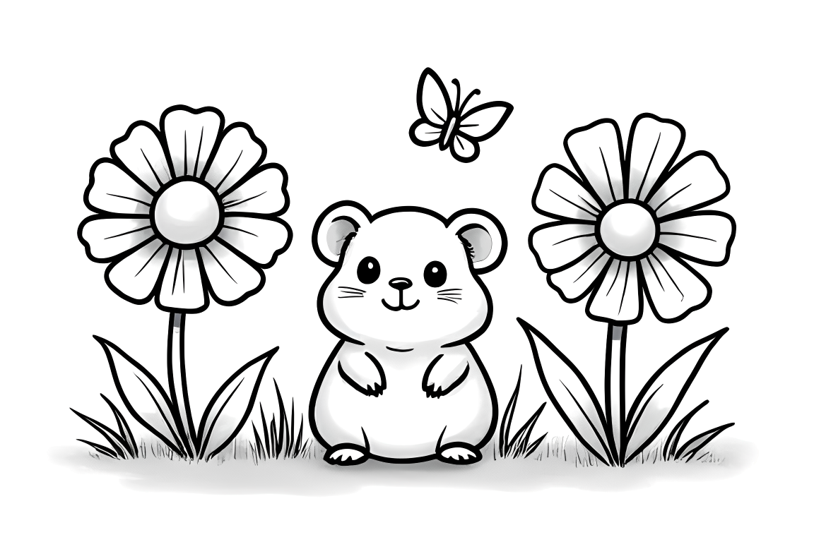 A sweet coloring page of a tiny hamster among three large simple flowers. This uncomplicated design features clear spaces and basic shapes that are perfect for young children's early coloring experiences.