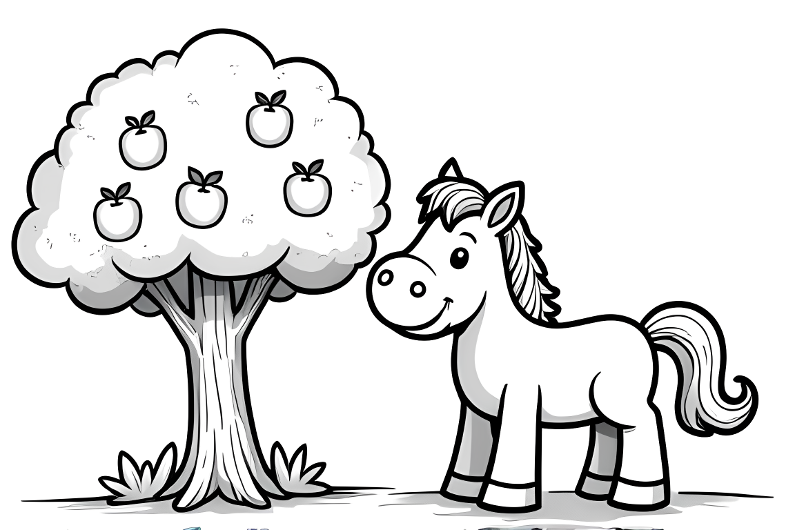 An easy-to-color illustration of a friendly horse standing under an apple tree. Designed with large, clear spaces perfect for toddlers' first coloring experiences.