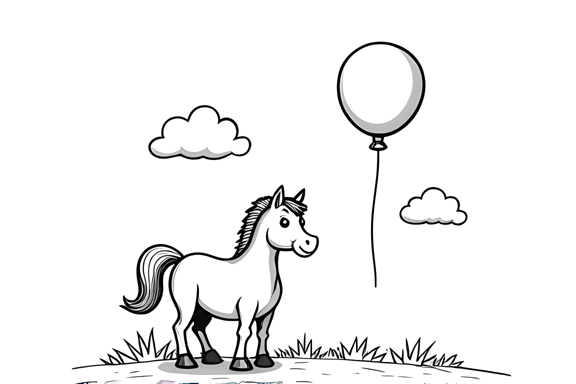A delightful coloring page showing a horse with a floating balloon. Designed with simple shapes and clear lines for young artists.