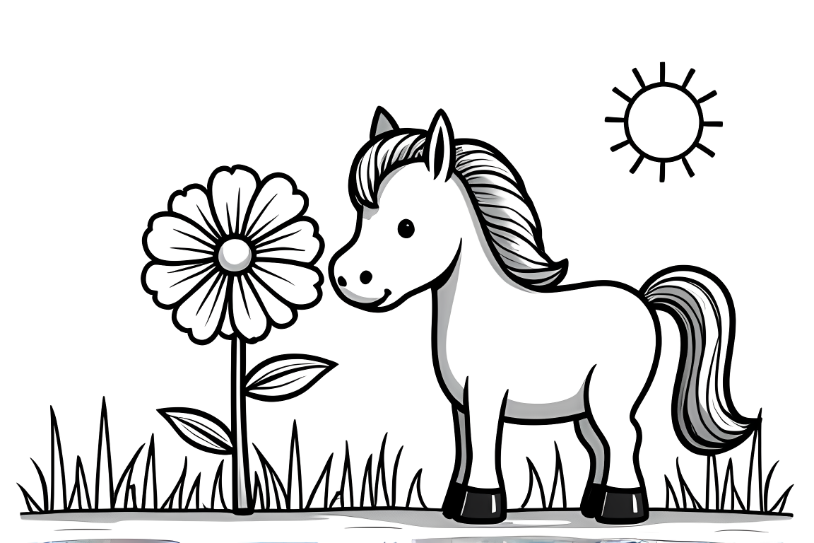 A sweet coloring page of a horse sniffing a large flower. Designed with basic shapes and clear lines for the youngest colorists.