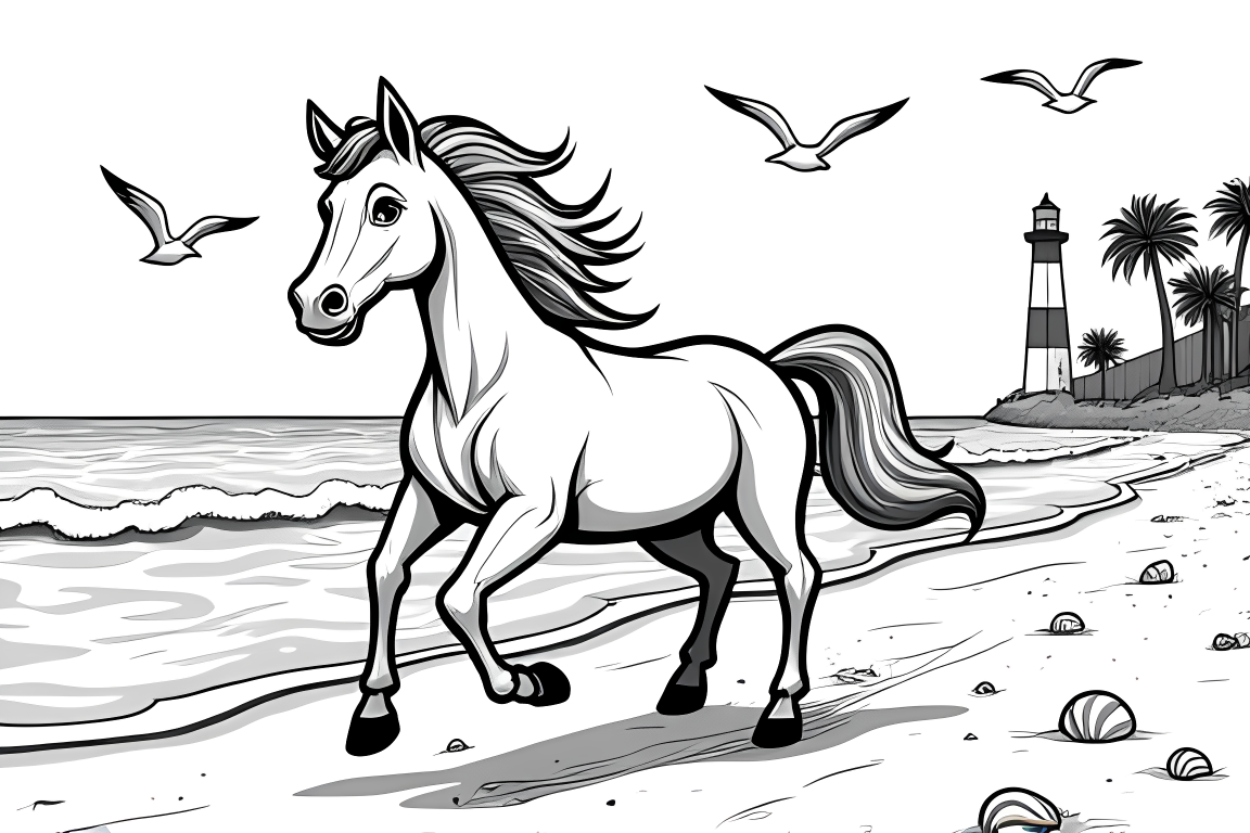 A fun coloring page of a horse enjoying a day at the beach. Features engaging details suitable for early elementary school children.