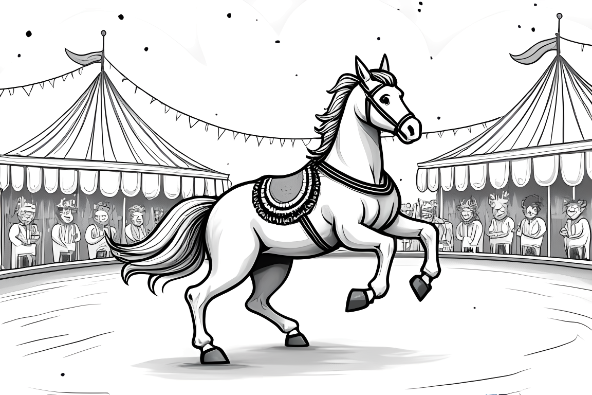 An exciting coloring page featuring a horse performing in a circus. Includes moderate details perfect for young elementary school artists.
