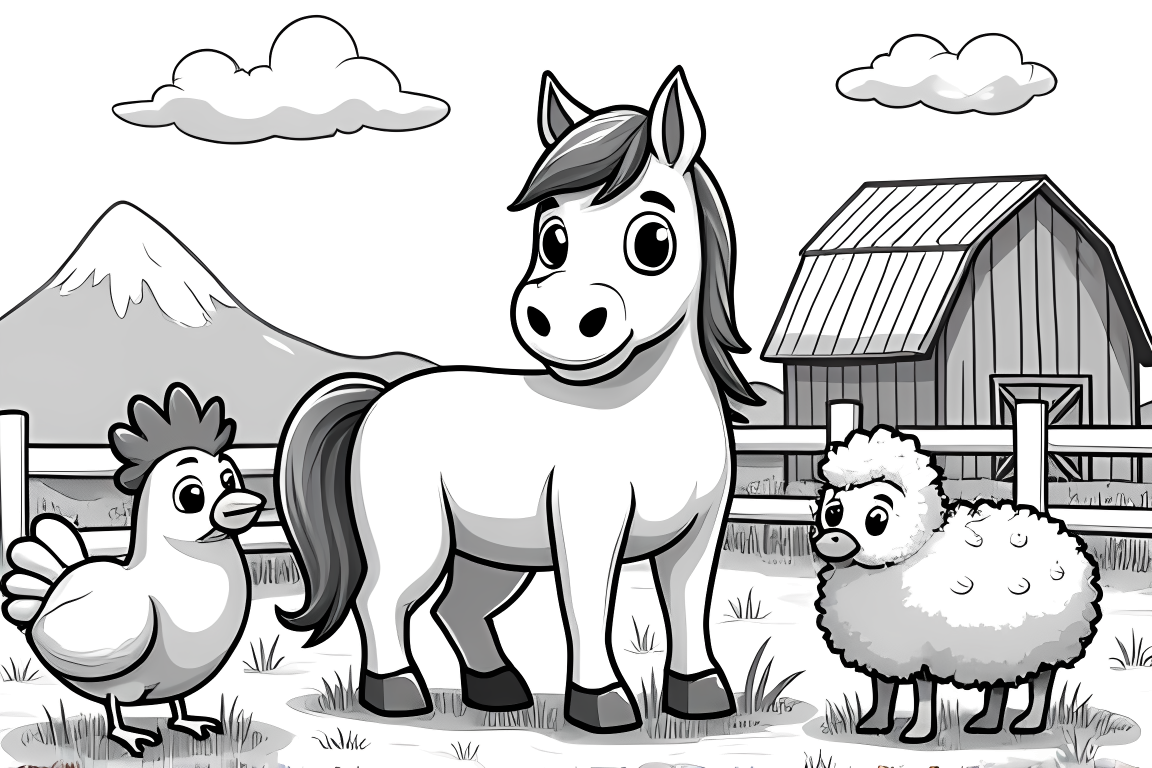 A lively coloring page showing a horse interacting with other farm animals. Perfect for early elementary school children.