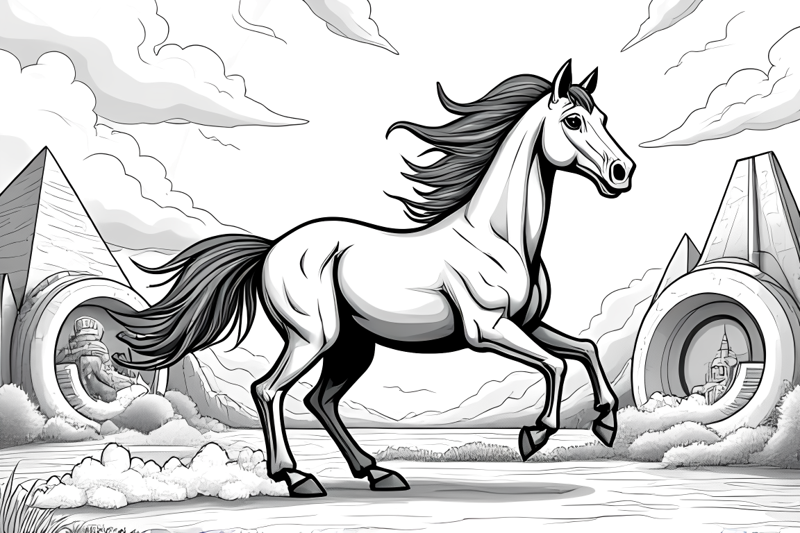 A complex coloring page featuring a horse traveling through different time periods. Perfect for older elementary school artists.
