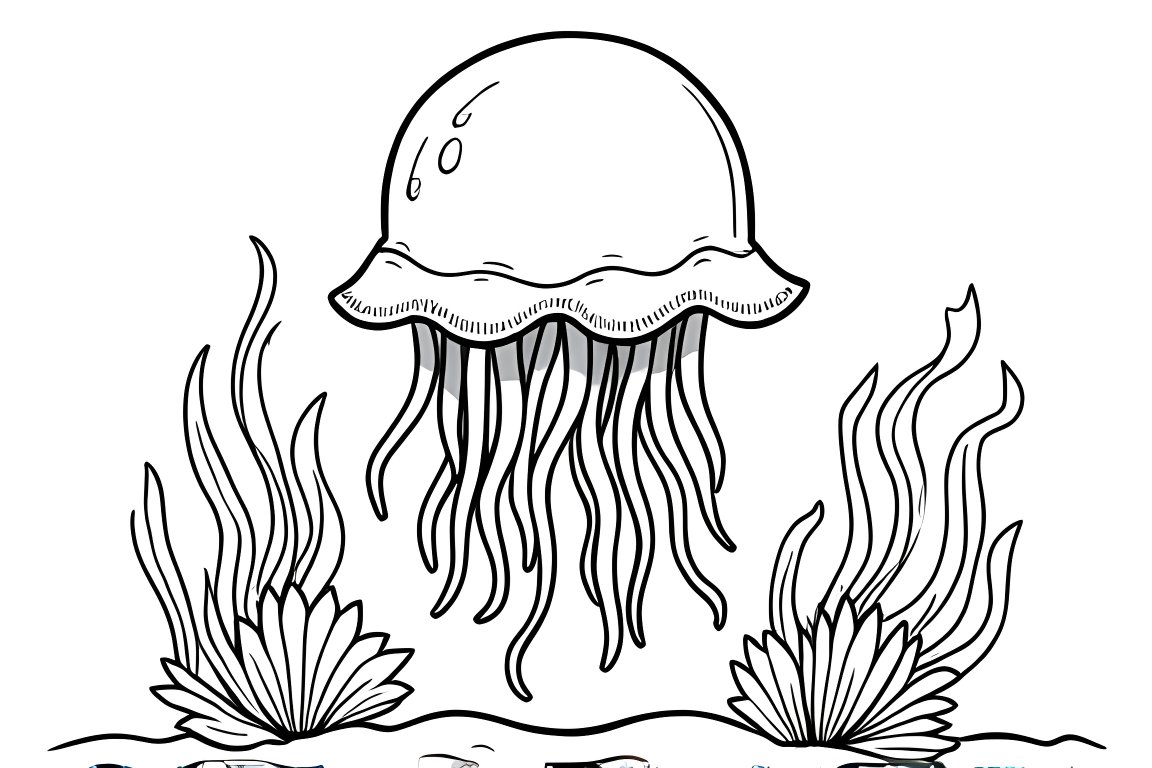 A charming underwater scene perfect for toddlers featuring a jellyfish floating among simple seaweed shapes. This basic design helps young children practice staying within the lines while exploring ocean themes.