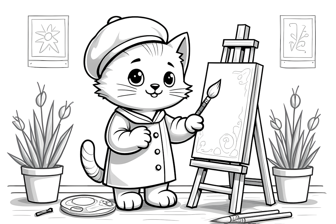 An inspiring coloring page featuring a kitten creating art. Designed with appropriate complexity for school-age children.