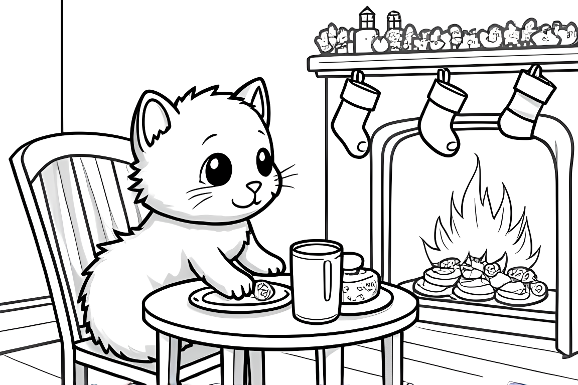 A charming scene of a kitten enjoying holiday treats near a fireplace. This coloring page offers balanced detail for developing coloring skills.