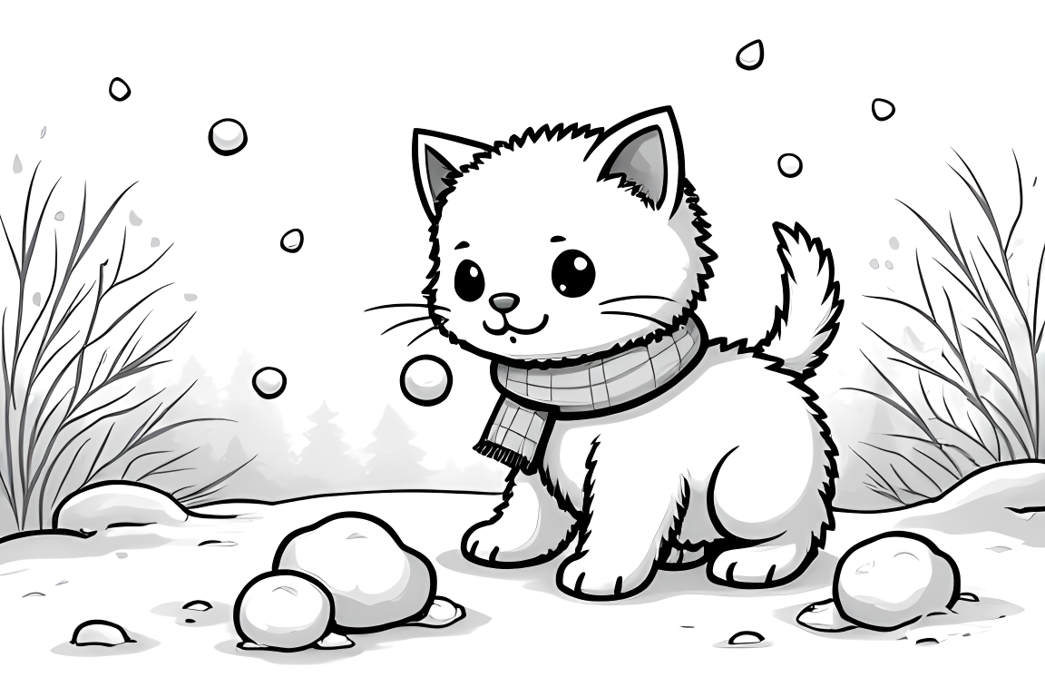 A delightful winter scene of a kitten playing with snowballs and wearing a scarf. This moderately detailed coloring page is perfect for elementary school children.