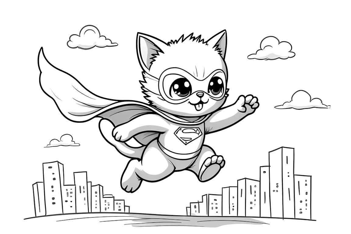 An exciting coloring page featuring a kitten superhero saving the day. Designed with appropriate complexity for elementary school children.