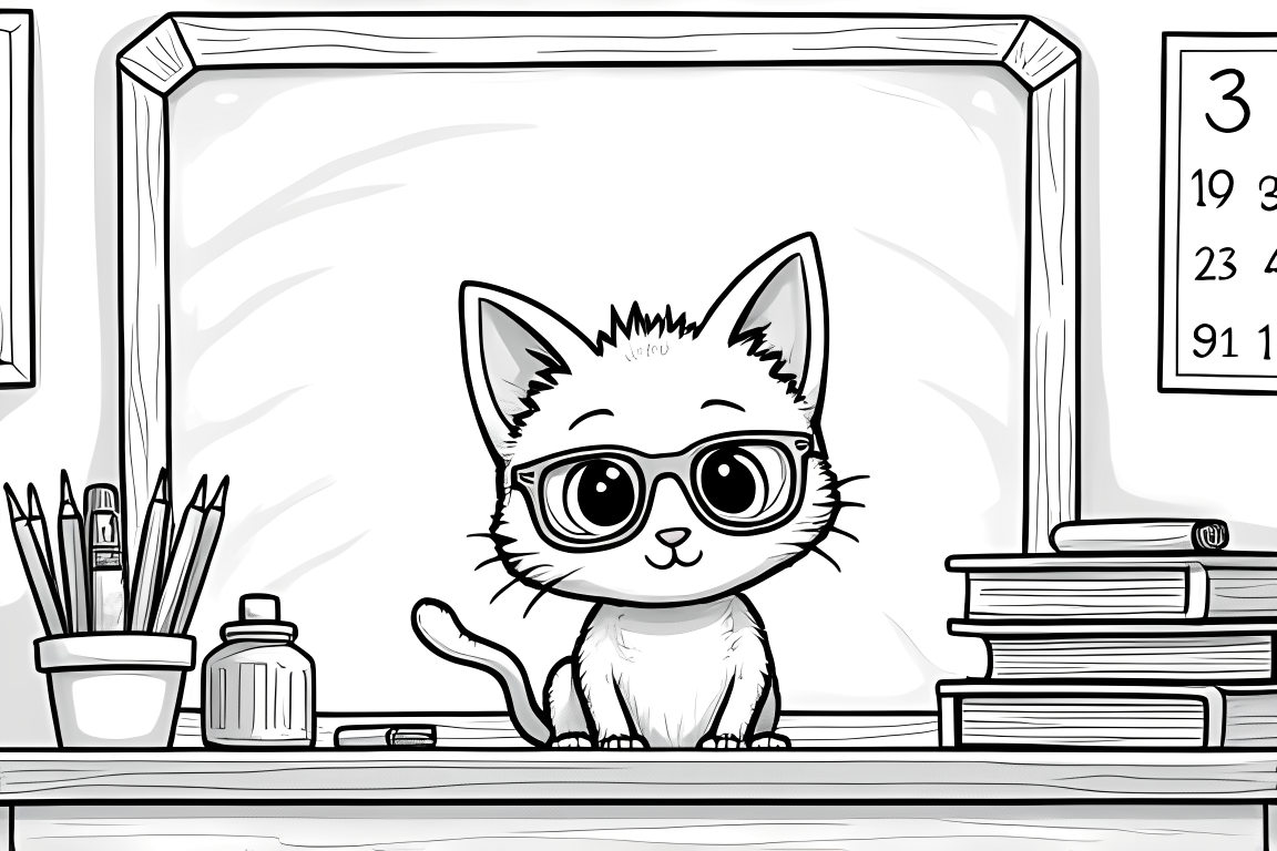 An educational coloring page showing a kitten teaching a class. Features appropriate complexity for elementary school children.