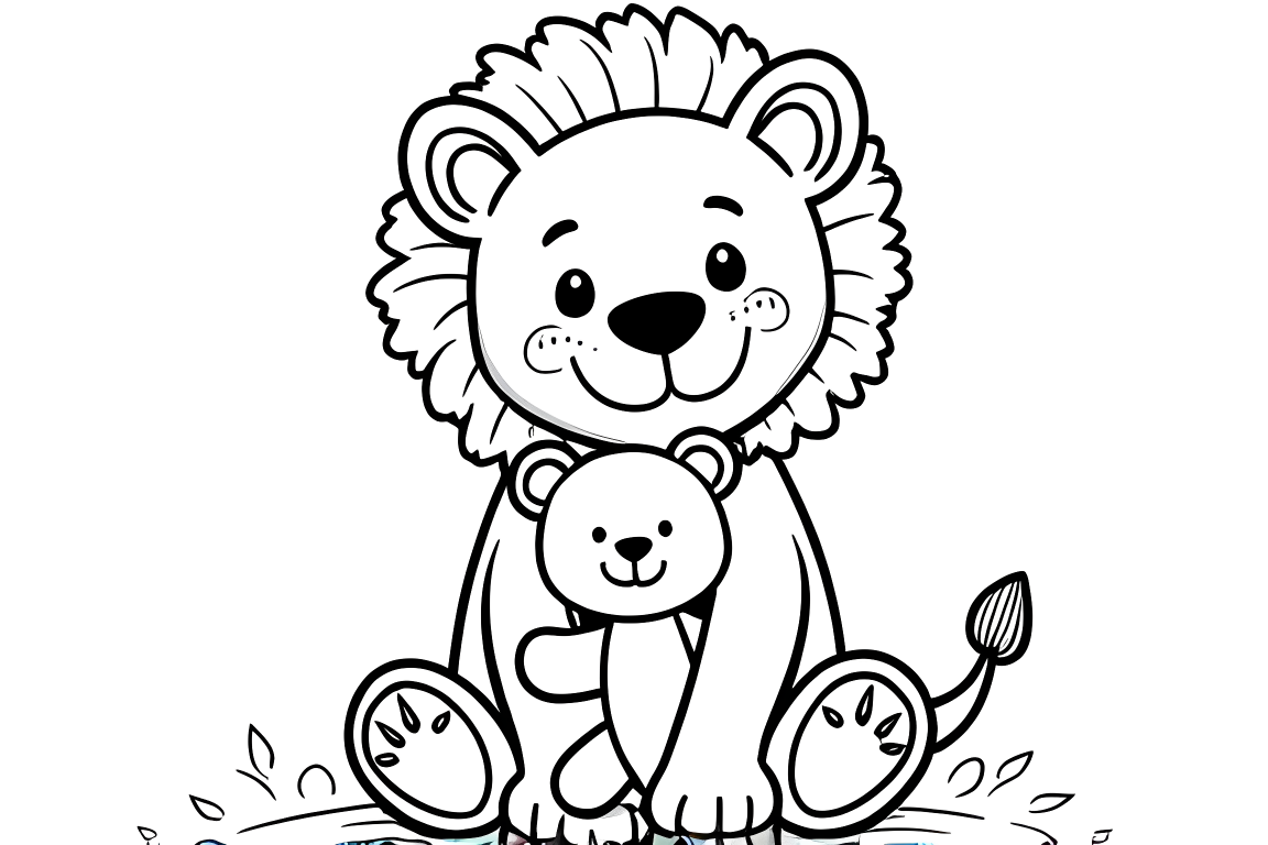 An endearing coloring page showing a gentle lion hugging a teddy bear, designed for the youngest artists. The basic shapes and minimal details make it an ideal choice for early coloring experiences.