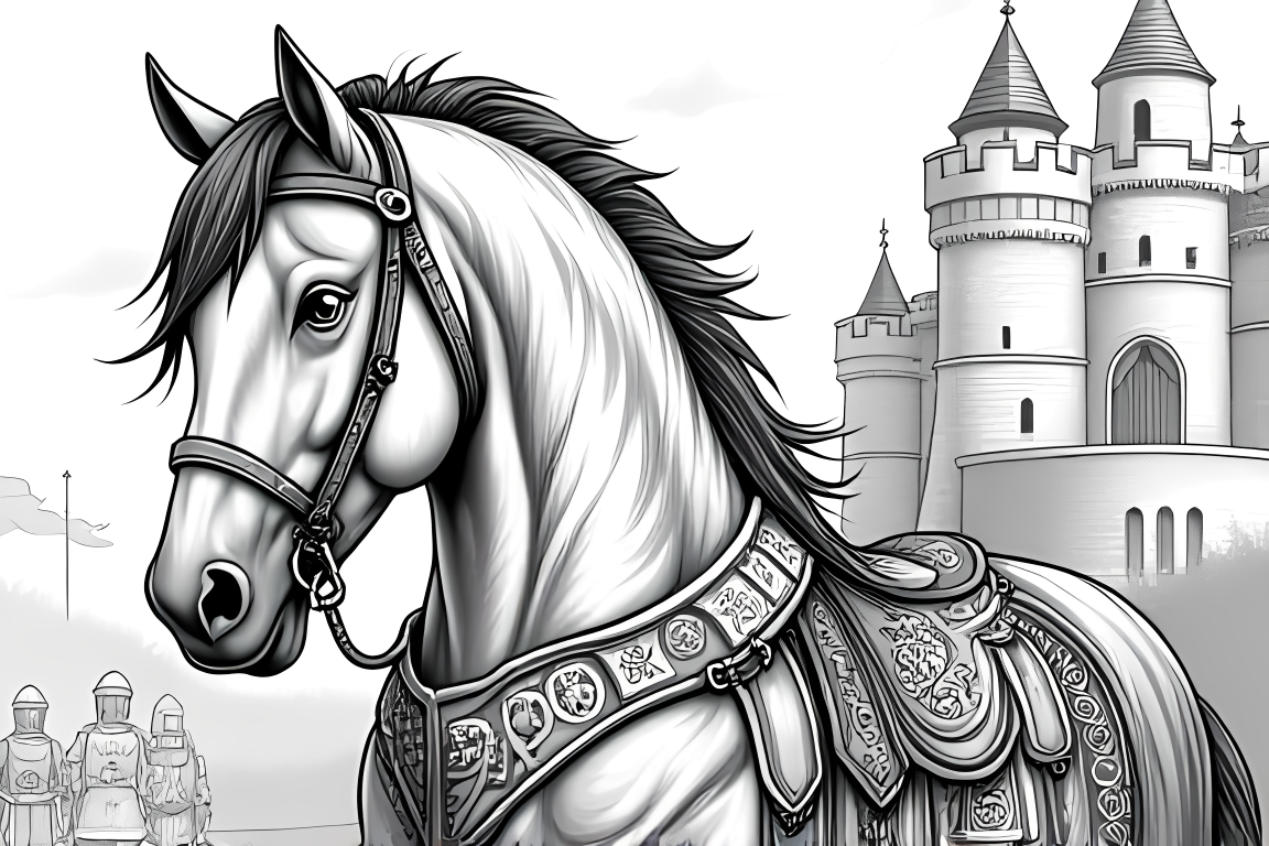 An elaborate coloring page featuring a noble horse in medieval knight's armor. Perfect for older elementary school children with its detailed design.