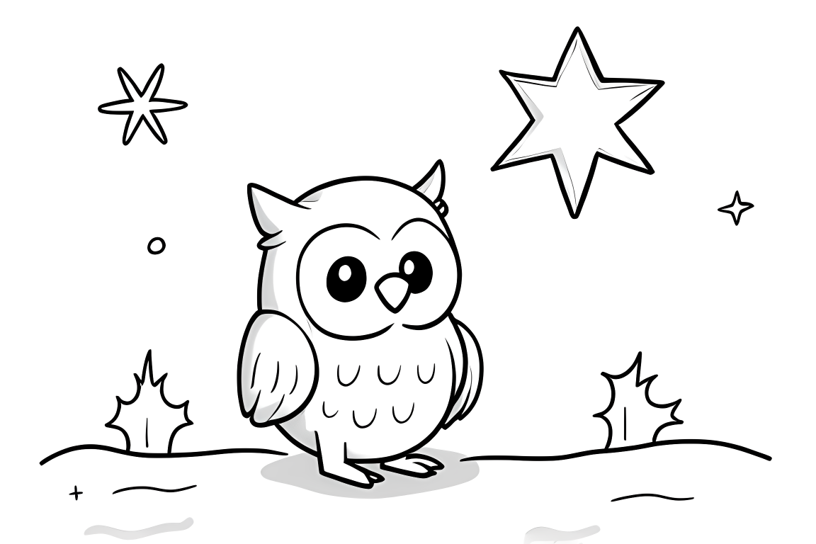 A cheerful baby owl reaches for a bright Christmas star in this toddler-friendly coloring page. Simple shapes and clear outlines make this festive illustration perfect for young children.