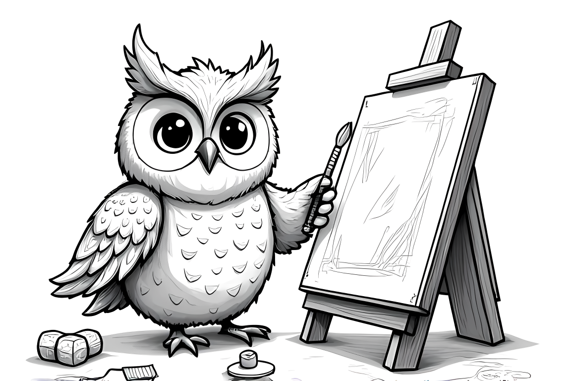A creative coloring page showing an owl painting at an easel. Features artistic elements with moderate complexity.