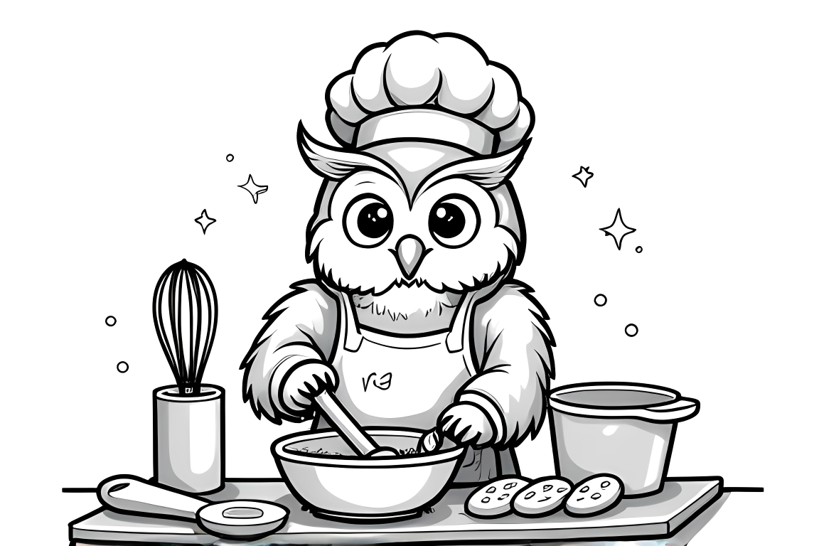 A delightful coloring page of an owl baking in the kitchen. Includes cooking elements with moderate detail.