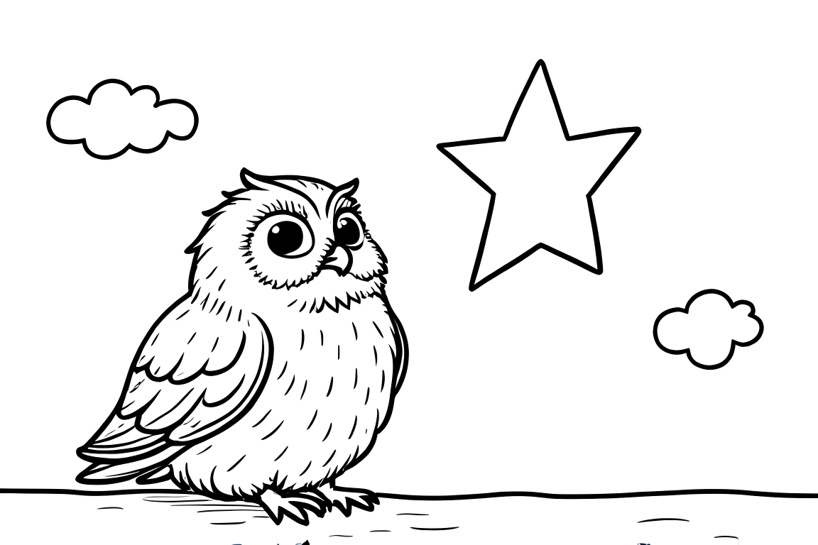 A delightful coloring page showing an owl reaching for a big star. Features simple shapes perfect for young children's first coloring experiences.
