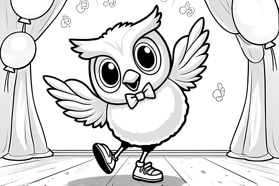 A fun coloring page showing an owl dancing with friends. Includes party elements with moderate complexity.