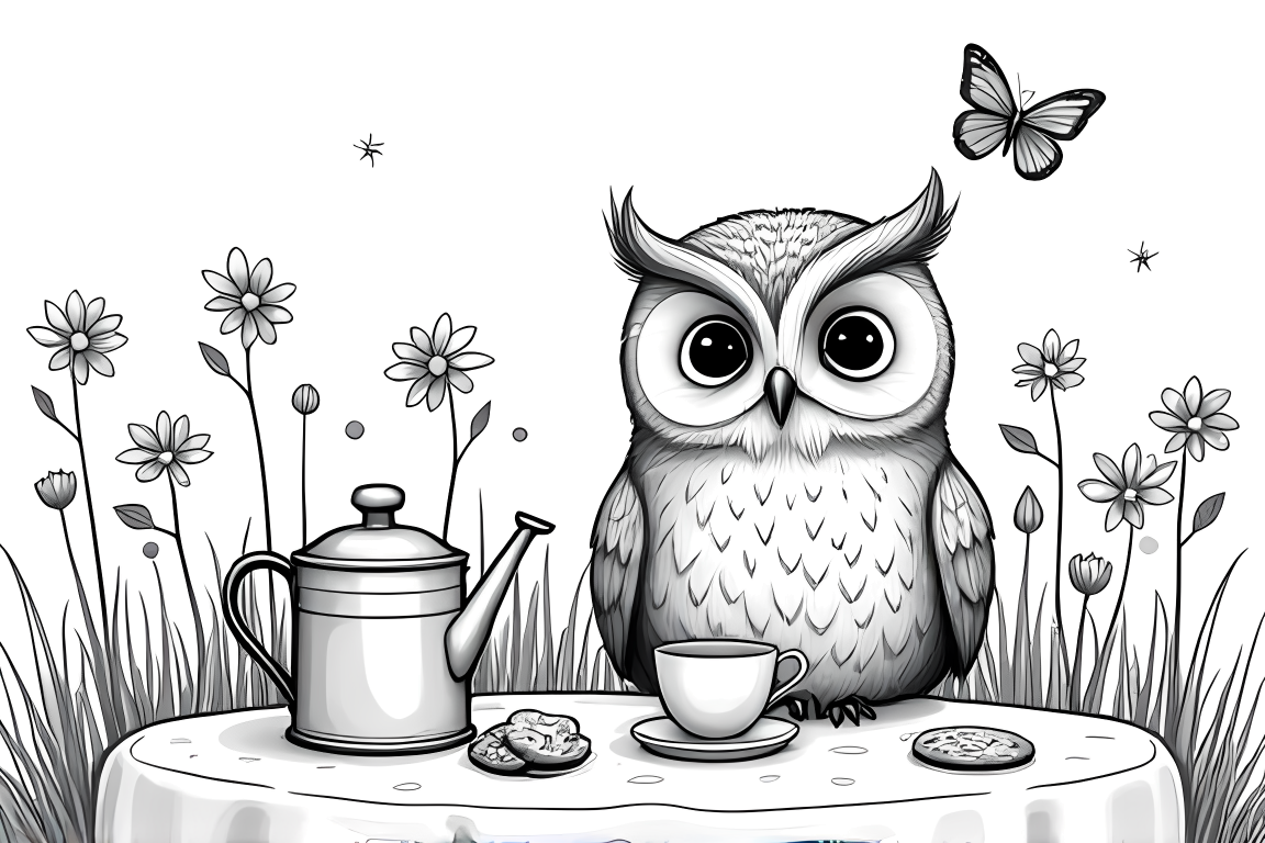 A cheerful coloring page showing an owl hosting a garden tea party. Features moderate detail suitable for elementary school children.
